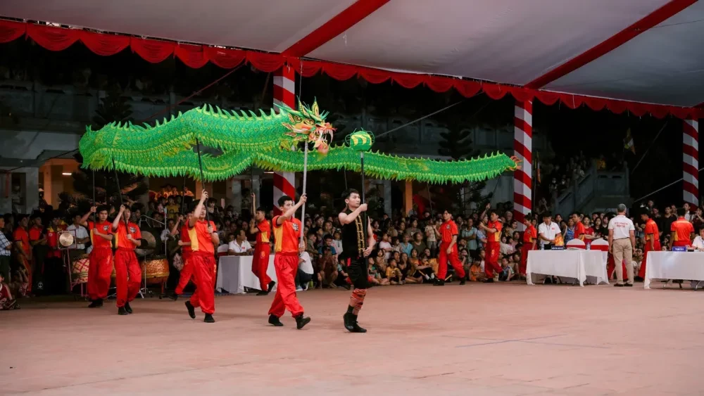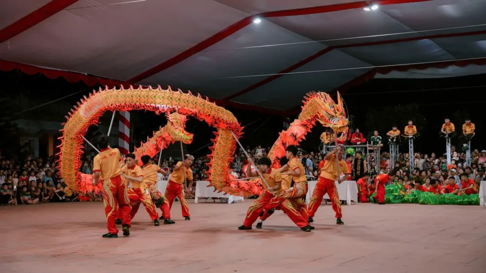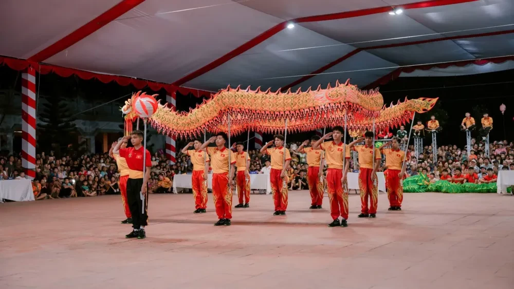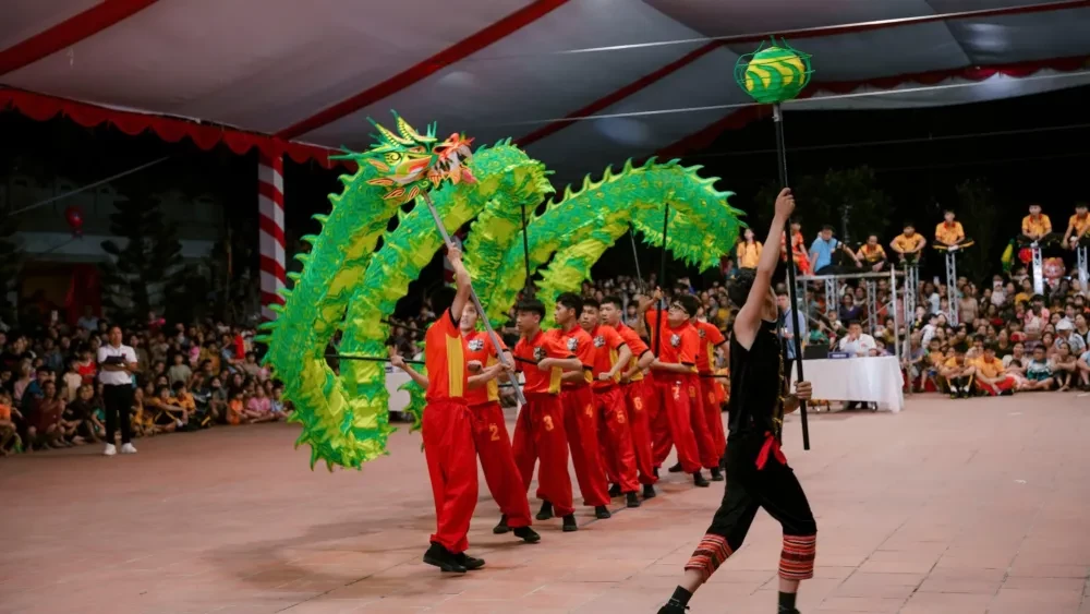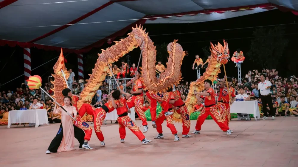 - Song Lân tranh cầu: hai chú lân cùng thi đấu trong một không gian hẹp, tranh giành “cầu lộc” treo cao – nội dung vừa kịch tính, vừa mang tính trình diễn đặc trưng.
