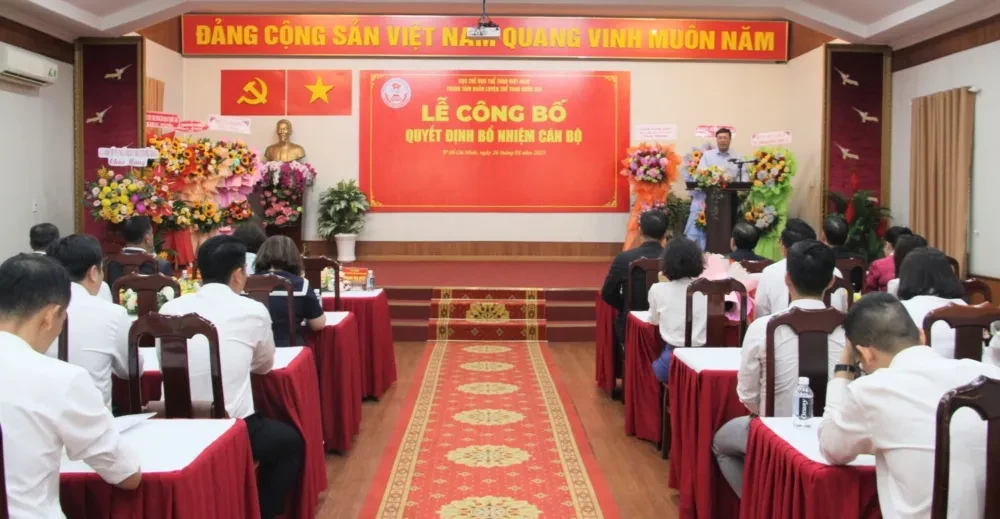 Thực hiện ý kiến chỉ đạo của lãnh đạo Cục Thể dục thể thao Việt Nam về kế hoạch tổ chức Lễ công bố Quyết định về công tác tổ chức và công tác cán bộ đối với Trung tâm Huấn luyện thể thao quốc gia, chiều qua ngày 26/3/2025, Trung tâm Huấn luyện thể thao quốc gia đã long trọng tổ chức Lễ công bố Quyết định quy định chức năng, nhiệm vụ, quyền hạn và cơ cấu tổ chức của Trung tâm Huấn luyện thể thao quốc gia và quyết định bổ nhiệm Ban Giám đốc Trung tâm.