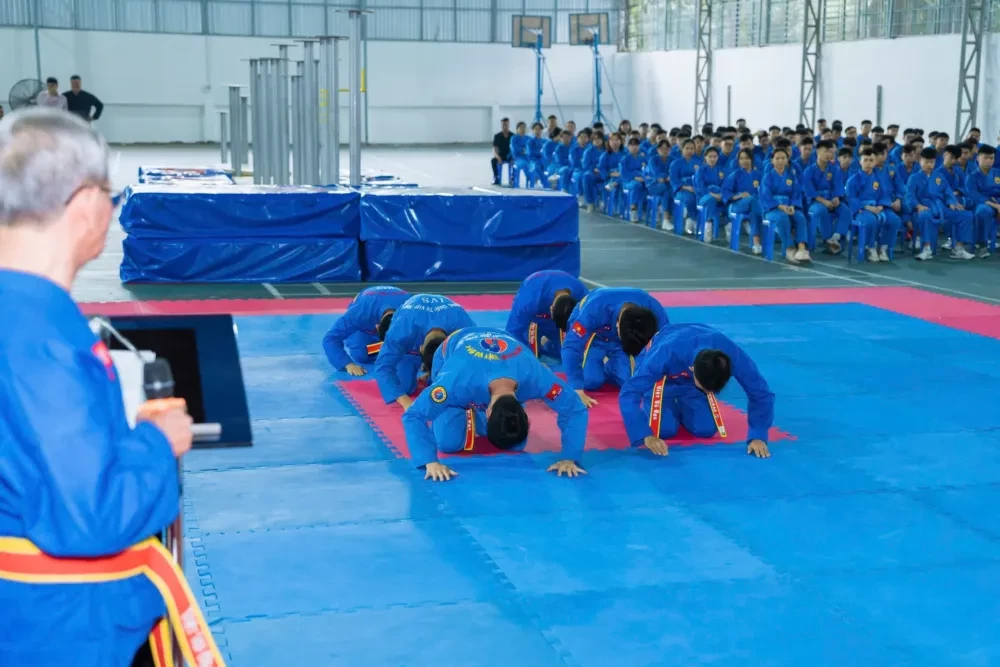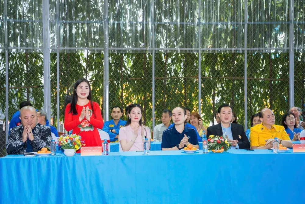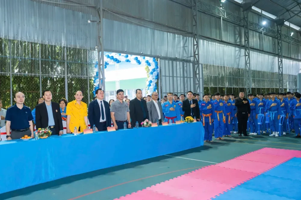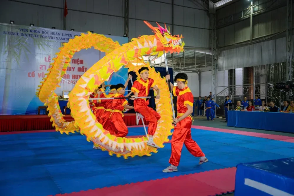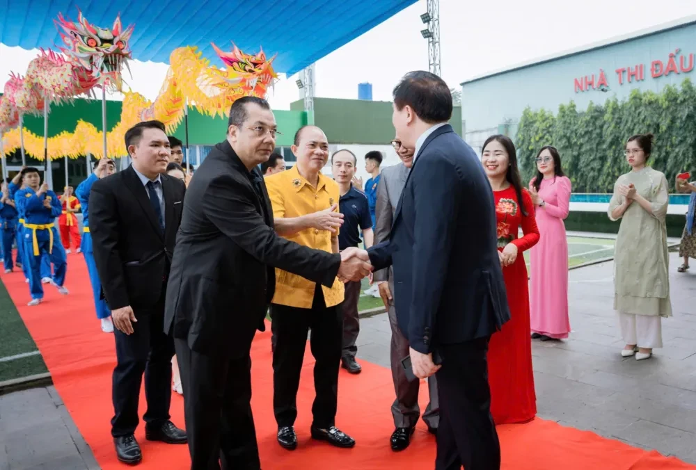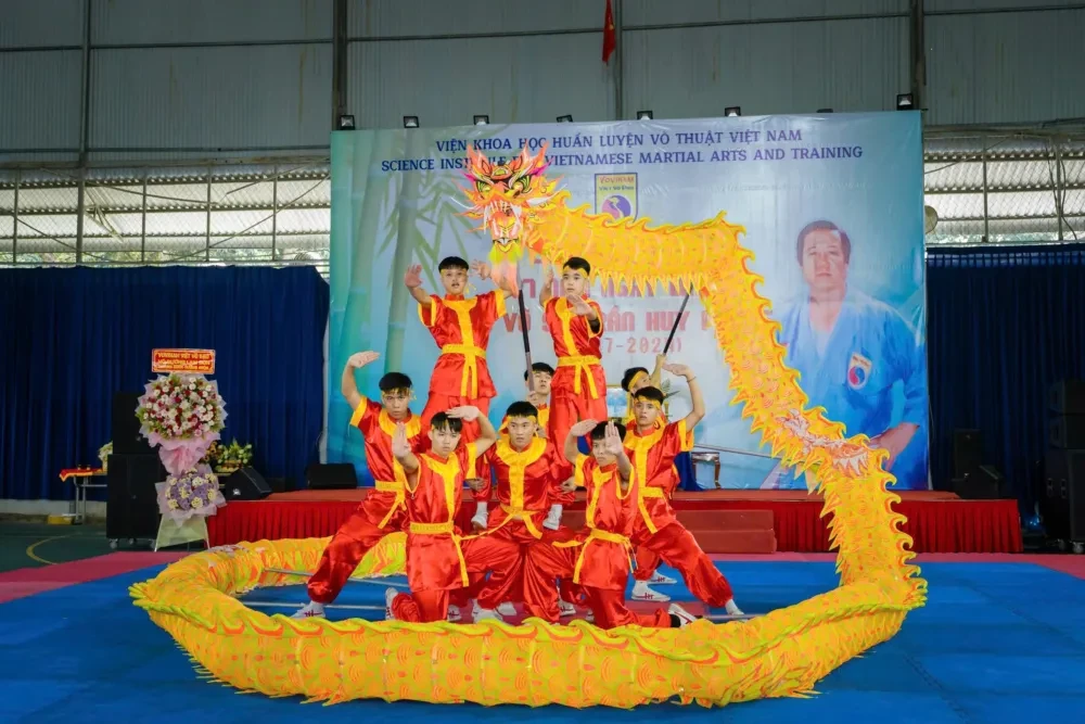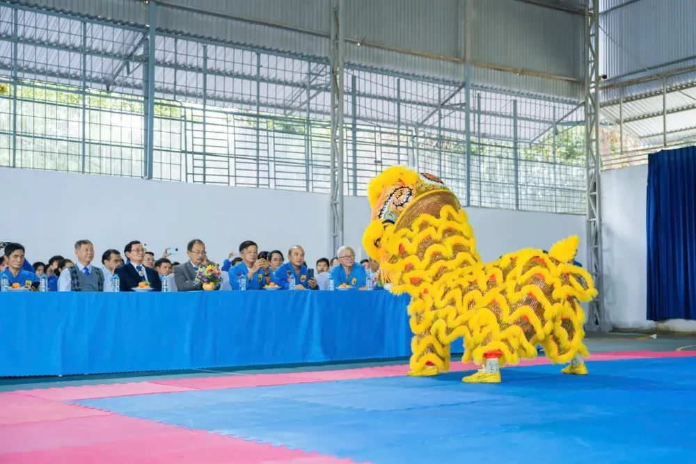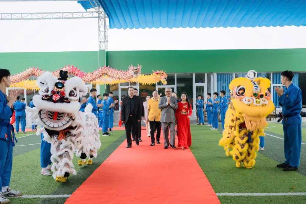Mở đầu buổi lễ là phần trình diễn múa sư tử trên mai hoa thung và múa rồng, cùng các tiết mục trình diễn võ thuật Vovinam do các học sinh của trường thực hiện. Các tiết mục gây ấn tượng mạnh mẽ với đoàn khách đến từ nước bạn Campuchia.